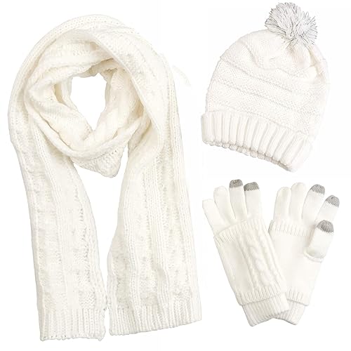 Winter Beanie Hat Scarf Gloves Set for Women, Womens Beanie with Pom Pom Long Scarf Neck Warmer Touchscreen Gloves 3 in 1 Set【Quality Fabrics】Knitted Hat Scarf Gloves Set is made from premium Acrylic Fibers, to ensure toasty warmth while feeling silky smooths the perfect soft and comfortable. 【Winter Touch Screen Gloves】Knit Gloves with Touch Screen Fingers with conductive ability to make sure the sensitive response to the smartphone or tablet screen. Enjoy the cellphone with our warm knitted touchscreen gloves on. 【Warm Knit Hat】This hat can be stretched and suitable for most women. What's more, it has reflective silk material in the POM POM which will reflect light in dark environment. Extra protection at night, trendy beautiful as well safe. 【Long Knit Scarf】The oversized scarfs keep your neck warm, various ways to wear it, make your own new design, around your neck single, double loops, one loop, shawl, shrug, wrap and find your favorite. 【Outstanding Gift Combo】Package Included: 1×Winter Hat + 1×Touchscreen Gloves + 1×Long Scarf (3 in 1 set). With our warm beanie knit hat scarf and gloves set, creating a nice and fashionable look design, matches with most formal and casual clothes. Outstanding gift combo to give to friends & family.