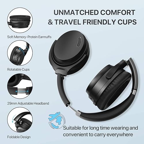 HROEENOI Active Noise Cancelling Headphones, JZ02 Bluetooth Headphones, Wireless Over Ear Headphones with CVC 8.0 Microphone Deep Bass Headset, 40 Hours Playtime for Travel Work TV Phone - Black