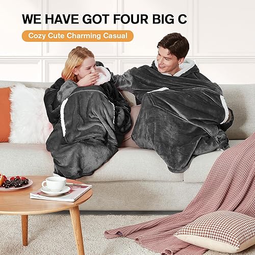 yescool Wearable Blanket Hoodie - Birthday Christmas Gifts for Women Mom Girlfriend, Oversized Flannel Sherpa Cozy Hooded Blanket Sweatshirt Adult With Hood Pocket & Sleeves, One Size Fits All (Grey)