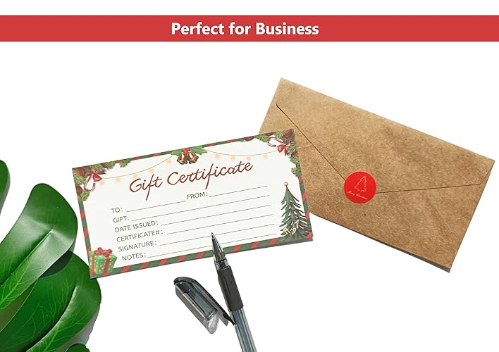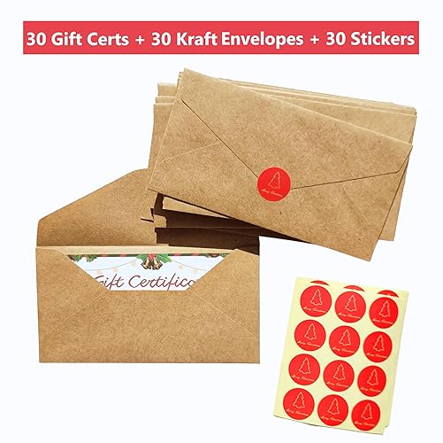 Gift Certificates for Business 30 Certificate Cards 30 Kraft Envelopes 30 Stickers for Holiday Christmas Small Business Restaurants Spa Beauty Makeup Hair Salon