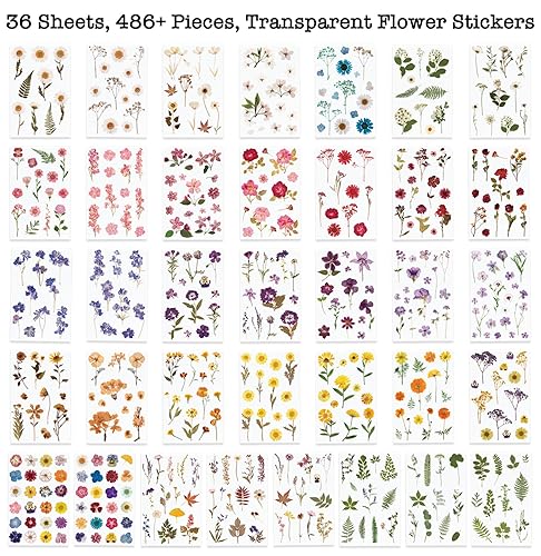 Knaid Pressed Flower Themed Stickers (Assorted 486 Pieces, 36 Sheets) Dried Floral Resin Stickers Decals Botanical Journaling Sticker for Scrapbook Supplies Junk Journal Bullet Journal Planner Laptop
