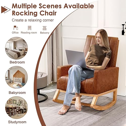 VECELO Leather Rocking Chair Nursery Glider Accent Rocker Modern Upholstered High Back USB Port and Side Pocket Armchair, Wood Legs for Living Room Bedroom Study