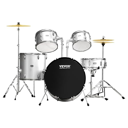 VEVOR Adult Drum Set, 5-Piece 22 inches Complete Full Size Drum Kit with Bass Toms Snare Floor Drum, Adjustable Throne Stands Cymbal Hi-Hat Pedal and Drumsticks, Beginner Drum Kit for Adults, Silver
