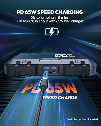 Car Battery Jump Starter 6000A Jump Box 65W Fast Charging (All Gas/12.0L Diesel), Portable Car Jump Starter Battery Pack, Battery Jumper Starter with Extended Jumper Cables, 600 Lumens Lights