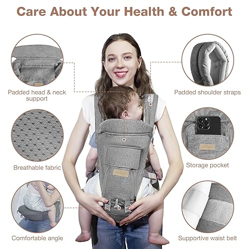AZQPOD Baby Carrier Newborn to Toddler - 6-in-1 Baby Carrier with Hip Seat, Ergonomic M Position Soft Breathable Mesh Adjustable Removable Infant Carrier for 7-44lbs, Ideal for Baby Shower Gifts, Grey