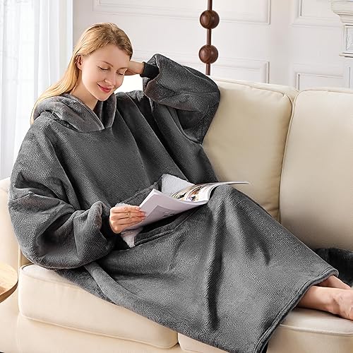 Wearable Blanket Hoodie, Sherpa Fleece Hooded Blanket, Oversized Hoodie for Adults Women Men, Cozy Blanket Sweatshirt with Giant Hood, Pocket & Sleeves, Gifts for Wife, Mom, One Size Fits All (Grey)